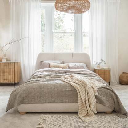 "Upgrade your bedroom with the St Agnes Upholstered Bed - 150cm. The comfy, upholstered headboard and wooden slats offer both style and support for a great night's sleep."